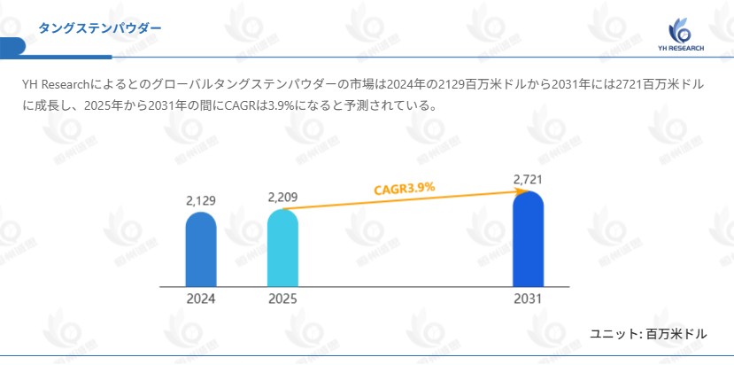 YH Research調査チームの最新レポート「グローバルタングステンパウダーのトップ会社の市場シェアおよびランキング 2026」によると、2024年の2129百万米ドルから2031年には2721百万米ドルに成長し、2025年から2031年の間にCAGRは3.9%になると予測されている。