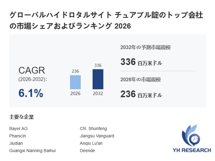 YH Researchの最新レポート「グローバルハイドロタルサイト チュアブル錠のトップ会社の市場シェアおよびランキング 2026」によるとのグローバルハイドロタルサイト チュアブル錠の市場は2025年の223百万米ドルから2032年には336百万米ドルに成長し、2026年から2032年の間にCAGRは6.1%になると予測されている。