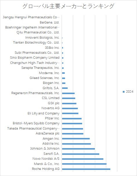 YHResearchのトップ企業研究センターによると、バイオ医薬品製造の世界的な主要製造業者には、Roche Holding AG、Merck & Co., Inc.、Novo Nordisk A/S、Sanofi S.A.、Johnson & Johnson、AbbVie Inc.、AstraZeneca plc、Amgen Inc.、Takeda Pharmaceutical Company Limited、Bristol-Myers Squibb Companyなどが含まれている。2024年、世界のトップ10企業は売上の観点から約55.0%の市場シェアを持っていた。
