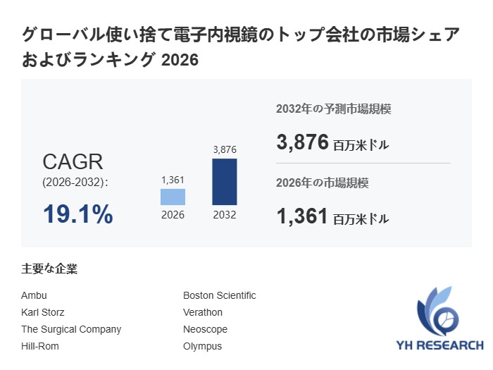 YH Researchの最新レポート「グローバル使い捨て電子内視鏡のトップ会社の市場シェアおよびランキング 2026」によるとのグローバル使い捨て電子内視鏡の市場は2025年の1174百万米ドルから2032年には3876百万米ドルに成長し、2026年から2032年の間にCAGRは19.1%になると予測されている。