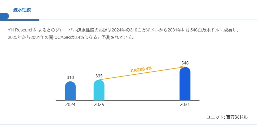 疎水性膜は、水処理、医療、電子機器、防水建材、化学プロセスなど幅広い産業用途に支えられ、安定的な需要を確保している。YHResearch調査チームの最新レポート「グローバル疎水性膜のトップ会社の市場シェアおよびランキング 2026」によると、2024年の310百万米ドルから2031年には546百万米ドルに成長し、2025年から2031年の間にCAGRは8.4%になると予測されている。