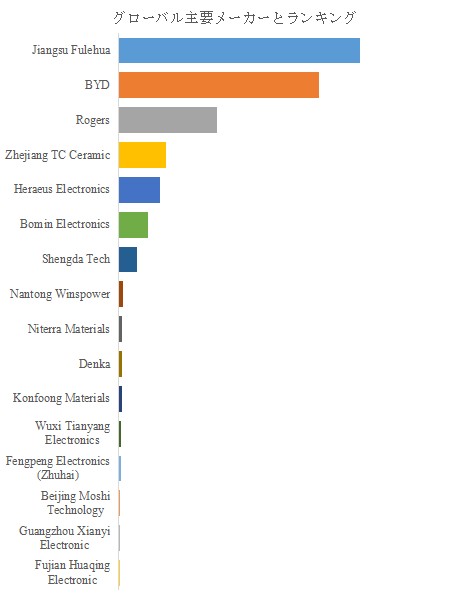 市場競争の構図は急速に変化している。特に中国勢の躍進が顕著であり、Jiangsu Fulehuaがグローバル市場において圧倒的なシェアを確立している。同社は量産技術とコスト競争力を背景に、電動車向けおよびエネルギー変換機器向けの大口契約を拡大している。これに次ぐBYDは、垂直統合型の生産体制を活かし、自社EVシステムへの内製供給を通じて材料技術の蓄積を進めている。RogersやHeraeus Electronicsといった欧米勢は、高耐熱AMBプロセスや銀焼結接合との複合技術開発で差別化を図っており、信頼性重視の産業用途に強みを持つ。一方、Zhejiang TC Ceramic、Bomin Electronics、Denkaなどが新素材の研究開発を推進しており、窒化ケイ素粉末の微構造制御や銅層密着性の最適化といったプロセス改良が競争の焦点となっている。全体として、素材技術・接合プロセス・量産対応力という三軸での競争が進み、サプライチェーン全体の高度化が進展している。