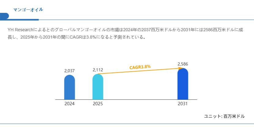 YH Researchの最新レポート「グローバルマンゴーオイルのトップ会社の市場シェアおよびランキング 2026」によると、2024年の2037百万米ドルから2031年には2586百万米ドルに成長し、2025年から2031年の間にCAGRは3.8%になると予測されている。