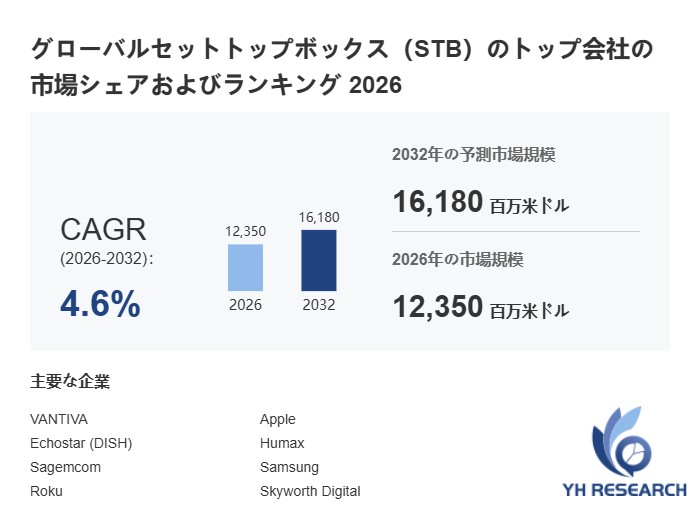 YH Researchの最新レポート「グローバルセットトップボックス(STB)のトップ会社の市場シェアおよびランキング 2026」によるとのグローバルセットトップボックス(STB)の市場は2025年の11830百万米ドルから2032年には16180百万米ドルに成長し、2026年から2032年の間にCAGRは4.6%になると予測されている。