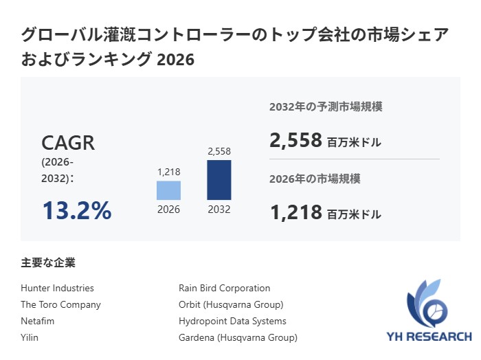YHResearchの最新レポート「グローバル灌漑コントローラーのトップ会社の市場シェアおよびランキング 2026」によると、グローバル灌漑コントローラー市場は、スマート農業や水資源管理需要の拡大を背景に、2026年から2032年にかけて年平均13.2%の高成長が見込まれている。