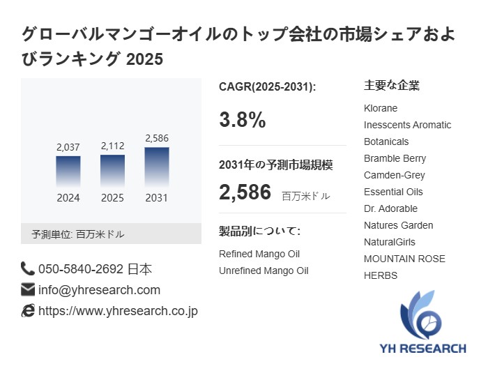 YH Researchの最新レポート「グローバルマンゴーオイルのトップ会社の市場シェアおよびランキング 2026」によると、2024年の2037百万米ドルから2031年には2586百万米ドルに成長し、2025年から2031年の間にCAGRは3.8%になると予測されている。