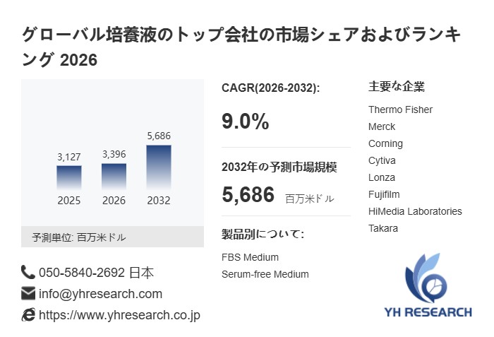 YH Researchの最新レポート「グローバル培養液のトップ会社の市場シェアおよびランキング 2026」によるとのグローバル培養液の市場は2025年の3127百万米ドルから2032年には5686百万米ドルに成長し、2026年から2032年の間にCAGRは9.0%になると予測されている。