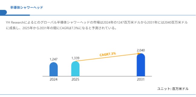 YHResearchの最新調査グローバル半導体シャワーヘッドのトップ会社の市場シェアおよびランキング 2025レポートによれば、2024年の1247百万米ドルから2031年には2040百万米ドルに成長し、2025年から2031年の間にCAGRは7.3%になると予測されている。この堅調な成長を下支えするのは、5G通信やAI技術、データセンター、自動車用半導体といった戦略的成長分野である。特にロジック半導体やストレージ向けの需要増大により、高精度なガス分配を実現するシャワーヘッドは製造装置の中核部材として不可欠な存在となっている。さらに、グローバルなサプライチェーンの拡張とともに、新興国市場での半導体投資が活発化していることも成長の後押しとなっている。このように、確固たる需要基盤と拡大を続ける応用領域に支えられ、本市場は中長期的に高い成長ポテンシャルを有しているといえる。