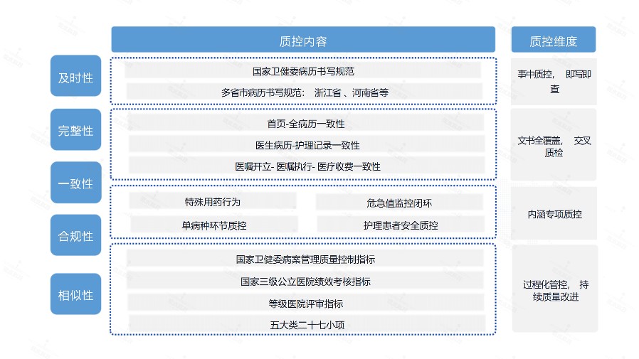 各国の保健当局は定期的に医療品質評価と病院機能評価を実施しており、診療録の質は中核的な評価項目の一つである。病歴品質管理システムは、診療録の質を定量的に評価し、追跡可能な品質管理レポートを生成することで、病院が評価で優位性を得ることを支援し、医療の質の継続的な改善に貢献する。